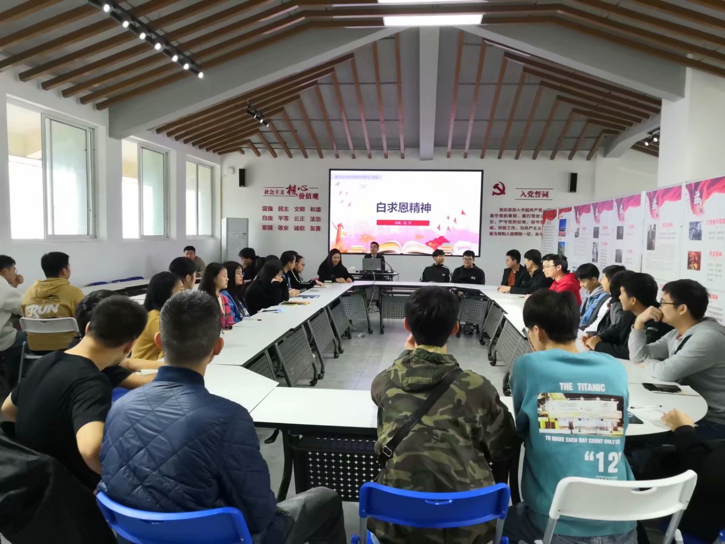全体同学按班次在文华楼七楼认真学习了马克思主义学院老师关于延安精神中“窑洞对”和“白求恩精神”的知识分享。学习中,同学们认识到中国共产党从古今中外的历史长卷中,深刻吸取教训,坚持立党为公、执政为民治天下的思想,把跳出历史周期率的“能”,变为国家长治久安的实现。体会到白求恩同志伟大的国际主义精神,为他人服务、毫无利己、专门利人的人格魅力。学习后带领同学们还参观马克思主义学院展览馆,进一步帮助大家更好地理解中国精神,特别是习近平新时代中国特色社会主义思想的精髓要义和实践要求。
