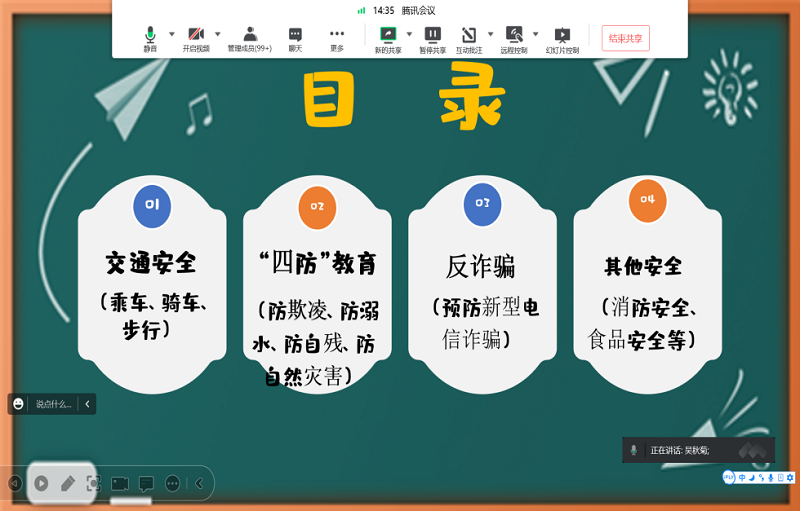 接着,辅导员强调了返校途中的安全问题,注意人身财产安全,乘坐正规、安全的交通工具,保持与家人、同学、老师的通畅联系;到校后仍要做好为期一周的个人健康监测,做自身健康的第一责任人。同时,针对防欺凌、防溺水、防自残、防自然灾害、反诈骗、消防安全、食品安全等进行安全强调。