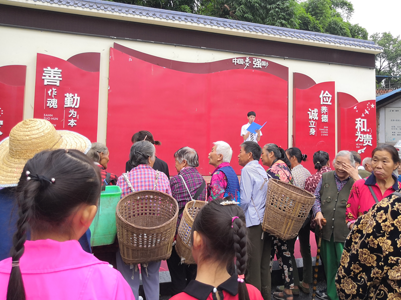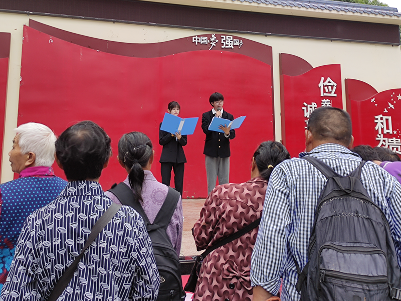 9月13日正是临江镇赶场,人来人往,各类吆喝声不断,志愿者们拿着厚厚的“中国故事,开讲了”宣传单穿梭在人群中。本次活动主要讲述了“袁隆平、邓钟南山”等中国名人的感人故事或英雄事迹,传递正能量。当主持人开始提问抢答,现场的氛围更是瞬间变得沸腾起来,志愿者们开始分发奖品时,让大家的情绪更加高涨。最后,活动结束,胡冰瑶老师和志愿者们邀请现场所有父老乡亲们上台合影留念,本次三下乡活动也顺利完成。